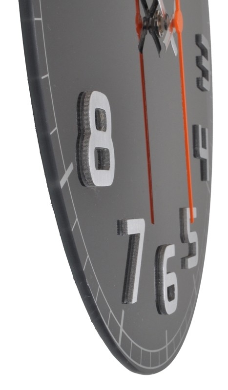 Skleněné hodiny s vystouplými čísly z nerezového kovu.