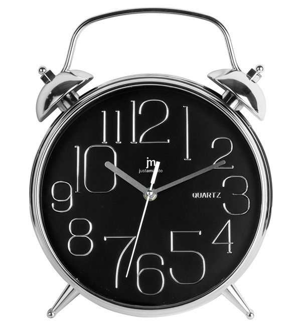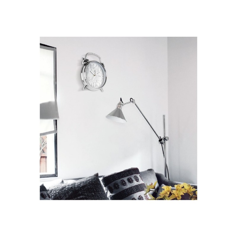 Nástěnné hodiny v imitaci budíku s embosovanými chromovanými čísly na ciferníku.