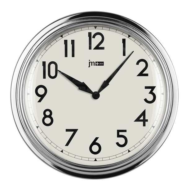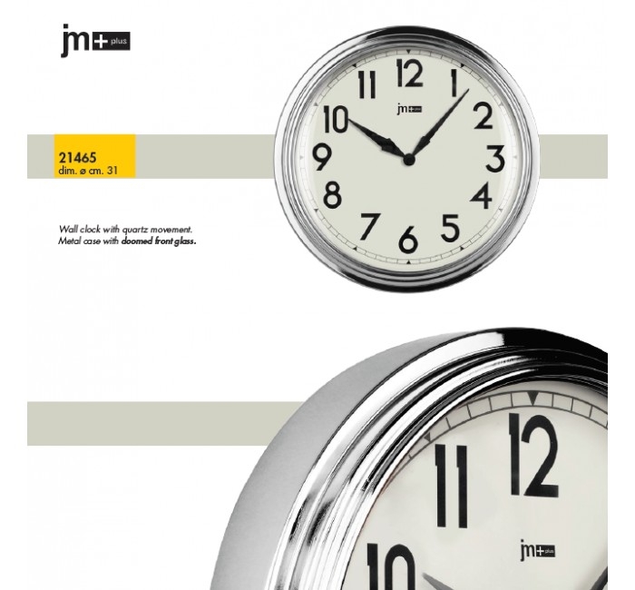 Nástěnné hodiny v kovovém chromovaném rámečku.