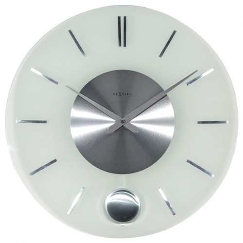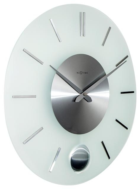 Skleněné hodiny s nerezovými indexy a kyvadlem.
