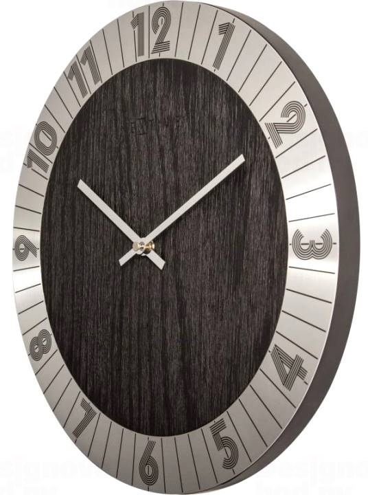 Masivní dřevěné hodiny v kombinaci se "stříbrným" kovem na ciferníku a kovovými ručičkami.