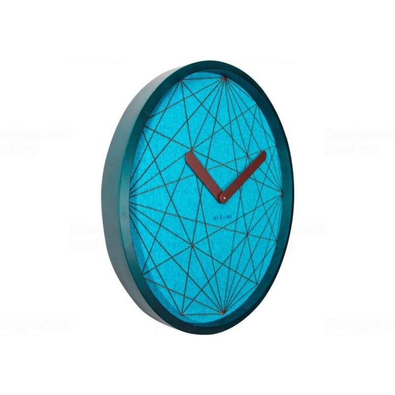 Dřevěný ciferník je potažený tyrkysovým plátnem.