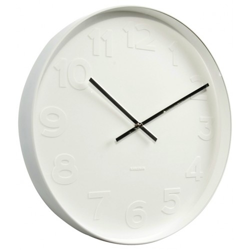 Minimalistické hodiny s embosovanými čísly a chromovanými ručičkami.