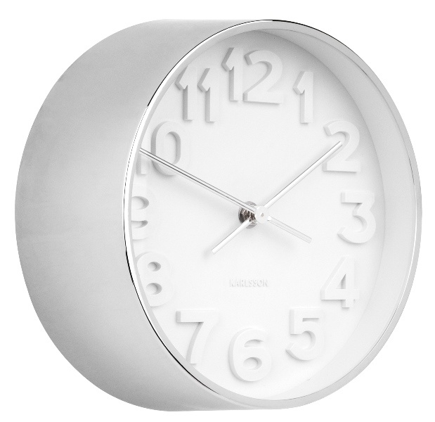 Elegantní hodiny v moderním designu s bílým ciferníkem na kterém jsou bílé embossované číslice.