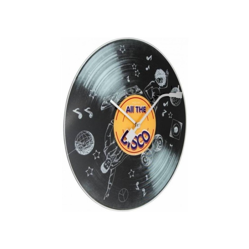 Skleněné designové hodiny s jasným hudebním motivem.