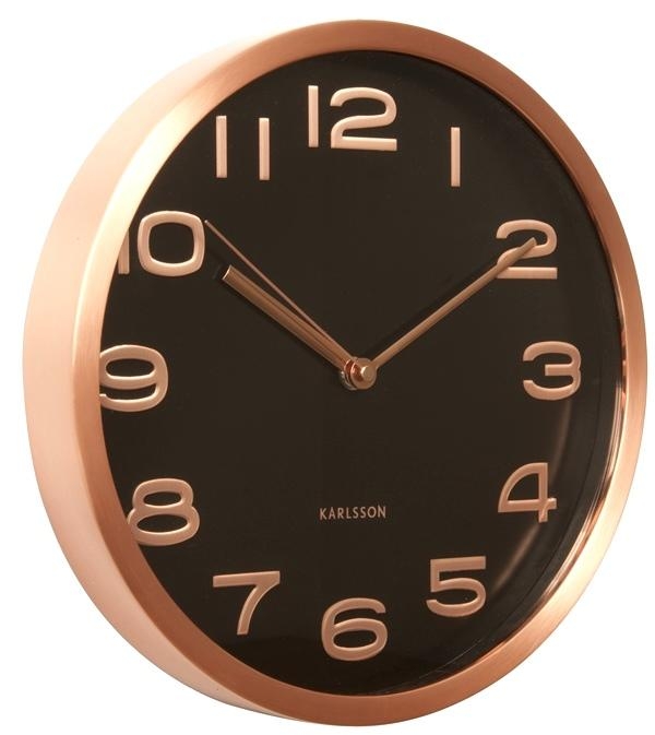 Černý ciferník s kovovými vystouplými čísly v měděném rámu.