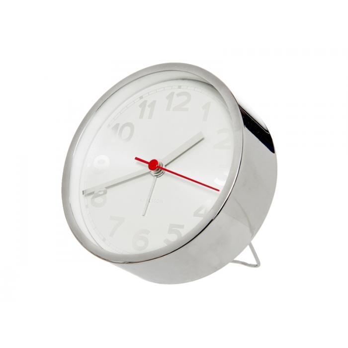 Designový budík se stříbrným rámem a bílým ciferníkem.