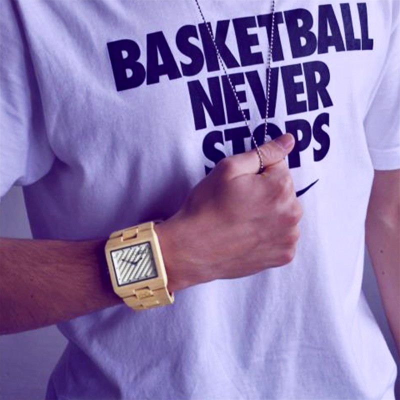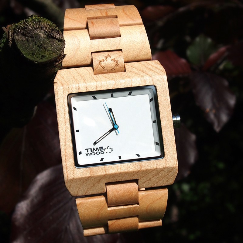 Elegantní hranatý design, důsledně dodržený i v ploše pro ciferník, ladí s použitým javorovým dřevem a dodává hodinkám, které v sobě mají japonský bateriový strojek Miyota Citizen, neotřelý vzhled.