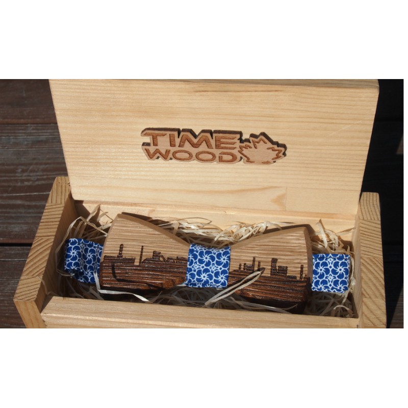 Ručně vyrobený motýlek z kvalitního českého dubového dřeva s panoramatickým gravírováním Ostravy. Doplněn je kvalitní látkou modro-bílé barvy ze 100% bavlny. Díky stahovací sponě dobře padne každému. Je to zkrátka motýlek k obleku, ale i k letním šatičkám.