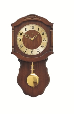 Klasické dřevěné hodiny s chromovaným kyvadlem.