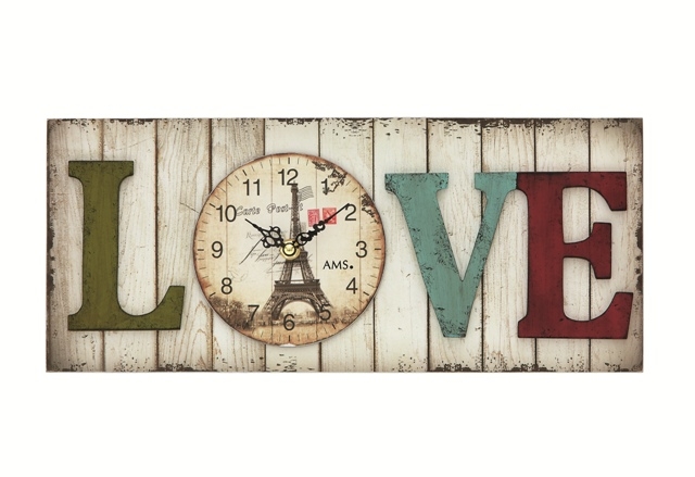 Netradiční nástěnné hodiny s nápisem "love" neboli láska.