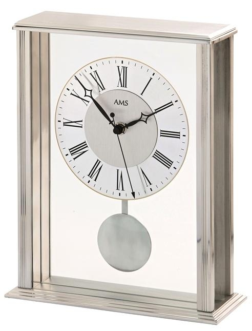 Kyvadlové stolní hodiny upevněny v kovové základně s chromovými doplňky.